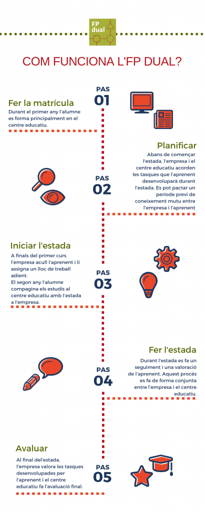 La Formació Professional (FP) dual és la modalitat de formació professional en la qual l’estudiant esdevé aprenent i combina la formació en el centre educatiu amb l’activitat a l’empresa.